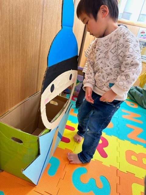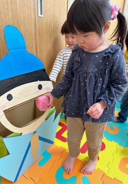 お内裏様とお雛様に、ひなあられを嬉しそうに何度も食べさせてあげる子どもたち。