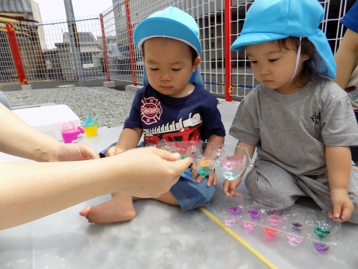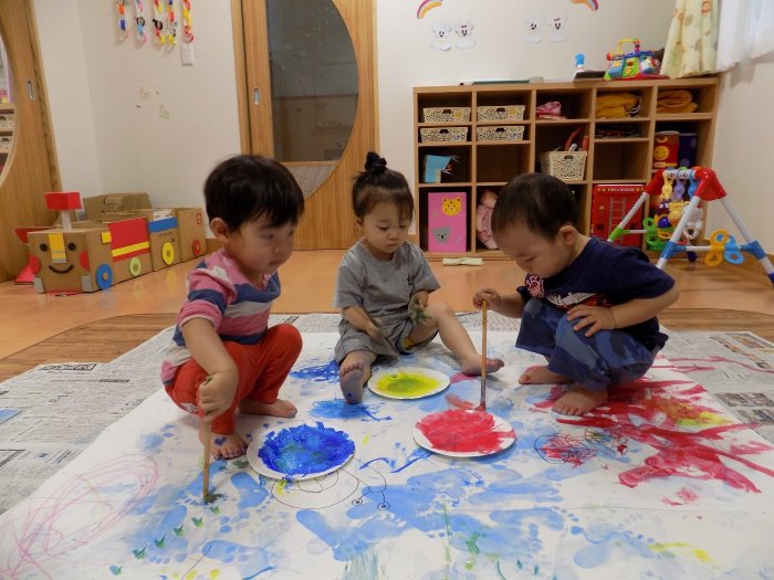 いろんな感触を楽しんだぞー! 2020/06/18(木) ペイント遊びでは、絵具でかきかき!!手形、足形もぺたぺた!! 色水遊びでは、色が混じるのを不思議そうに見ています。 時の記念日にみんな大好きカエルの時計を作ったよ☆★ 絵具や色水など子どもたちが触っていろんな感触を感じて興味をもって遊んでいます♬ ※現在も見学・入園申し込み随時受付中です。 お気軽に電話・メールのお問い合わせをお待ちしております。