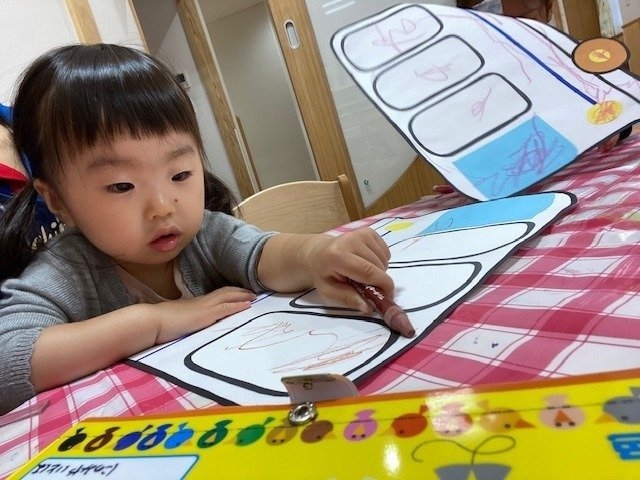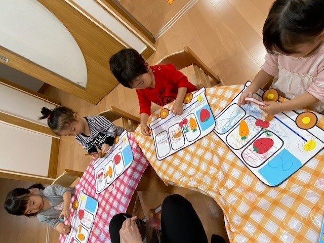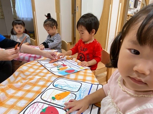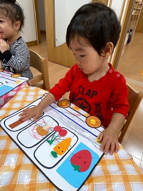 おべんとうバス 2020/10/15(木) 最近のお気に入りの歌♬ おべんとうバスの製作をしました。歌に合わせて「いちごさ~ん」「にんじんさん」と上手にバスに乗せてあげていましたよ! もうすぐ近くの公園へお弁当を持ってお出かけする予定もあるのでお話をすると「いく~!」と楽しみにしているようです☆ ※現在も見学・入園申し込み随時受付中です。 お気軽に電話・メールのお問い合わせをお待ちしております。