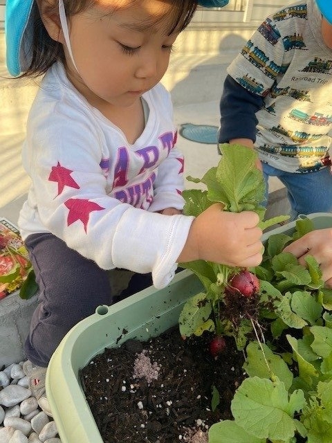 元気いっぱいです! 2020/11/17(火) ぽかぽか陽気の日には、みんなでテラスでおやつを食べたり、近くの公園までお散歩へ。 砂場や遊具で、先生やお友だちと楽しんで遊べています☆ みんなで種まきして育てたラディッシュもたくさん収穫できて、給食で食べました! お部屋では、おあつまりでもよく歌っている『おおきなくりのきのしたで』の栗を作りました。 絵の具でスタンプをしたり、クレヨンやのりを使って、可愛い栗が出来上がってみんな嬉しそうでした☆