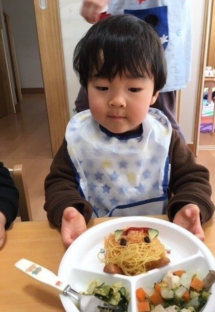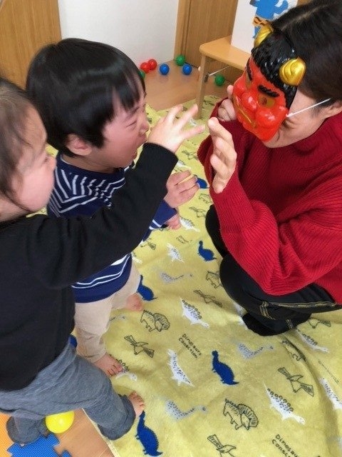 ☆節分☆ 2021/02/04(木) キッズルームでも豆まきをしました!自分たちで作った鬼を的にして「鬼は外♬」 すると鬼の姿が....逃げる子や泣いてしまう子もいましたが、最後は無事、鬼を追い払うことができました!! 給食は鬼さんライス♬嬉しそうな子どもたちでした!!