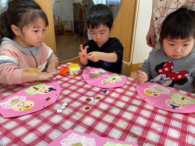 ひなまつり楽しかったよ(^^♪ 2022/03/04(金) 3月3日 ひなまつり遊びをしました(^^♪ おひなさまに色塗りをしたり、ぞう組さんは目隠しをして福笑いにも挑戦‼ みんなで楽しい時間を過ごせました☆