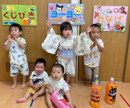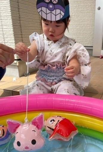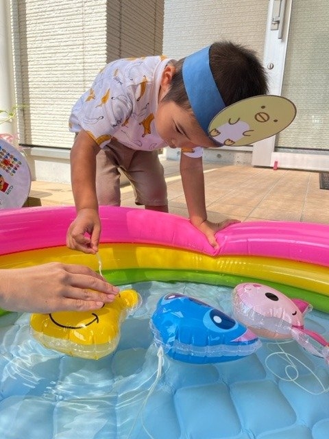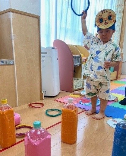 夏祭りがありました~ 2022/08/05(金) 毎年恒例の夏祭りを行いました~ 当日は甚平を着て来たり、とっても楽しみにしていた子どもたち(^^♪ わなげやヨーヨー釣りに、お面…すごく嬉しそうでした!